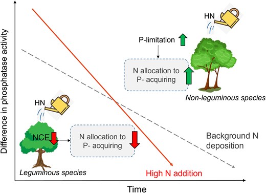 Whether the “phosphorus-acquiring advantage” of legumes in subtropical regions can persist under long-term nitrogen deposition remains unclear. Here, we demonstrate that prolonged high-nitrogen inputs accelerate the loss of this advantage in legume plantations.