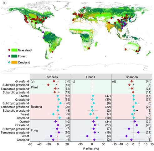 Fig.1 Global distribution of phosphorus-addition experimental sites (a) and effects of phosphorus addition on plant and microbial diversity across major ecosystem types (b–d).