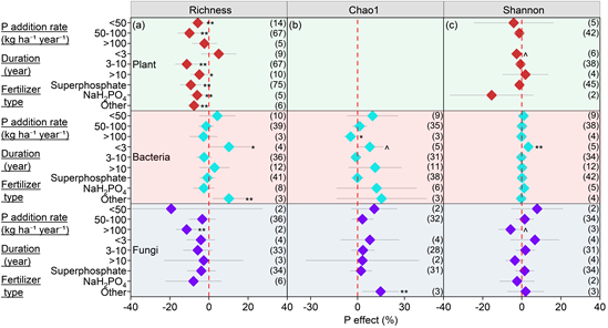 Fig.2 Effects of phosphorus addition on biodiversity across different experimental designs.