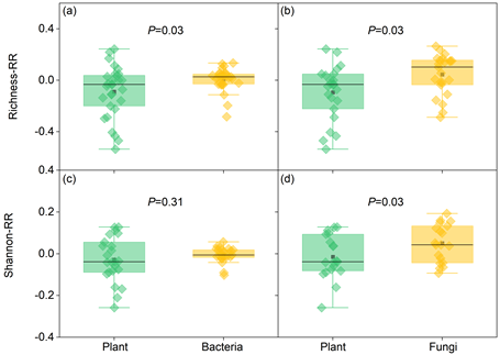 Fig.3 Contrasting response ratios of species richness and Shannon diversity among plant, bacterial, and fungal communities under phosphorus addition.