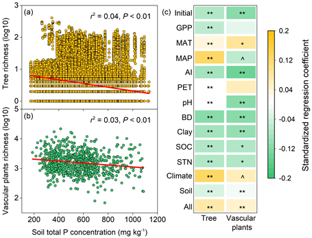 Fig. 4 Global patterns linking soil total phosphorus with species richness of forest trees and vascular plants.