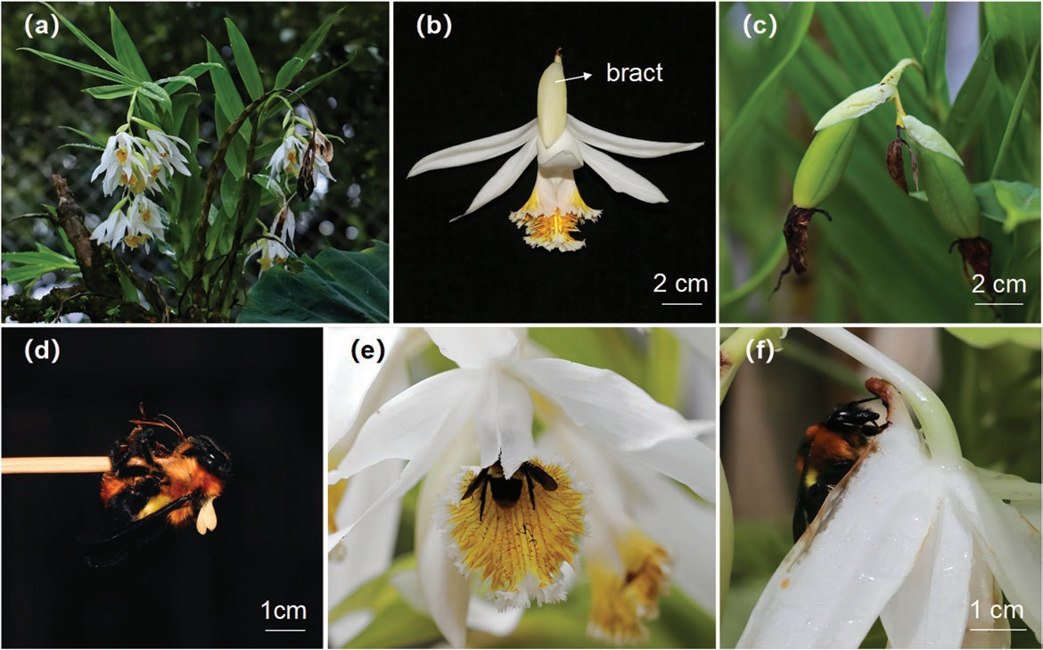 Figure 2: Flowers and fruits of Thunia alba (a, b, c) , Bombus breviceps carry pollinia of T. alba and visit the flowers in different ways (d, e, f)