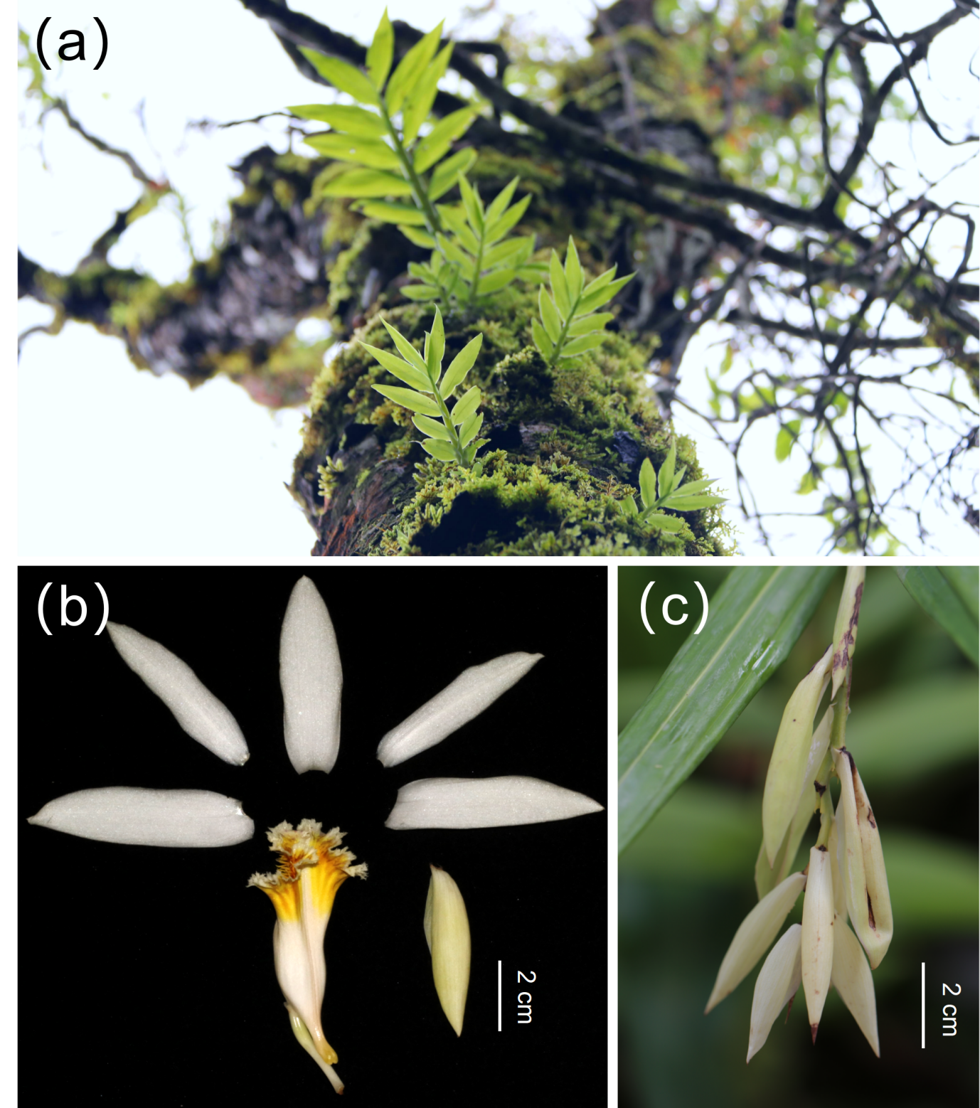Figure 1: (a) Habitat of Thunia alba. (b) Floral structure of T. alba. (c) Persistent bract of T. alba.
